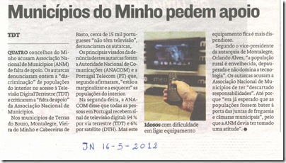 Mão amiga fez-me chegar a notícia que reproduzo acima. Pois… parece que há quem se tenha deixado dormir, embalado pelas promessas de tecnologia acessível a todos, e só tenha acordado agora para a triste realidade que é a distribuição da TDT em Portugal. O caso em foco é no Minho, mas nas notícias das últimas semanas não têm faltado exemplos de situações semelhantes um pouco por todo o país. É o que temos, dirão alguns! Mas podíamos ter mais, claro que podíamos. Haja quem reclame!